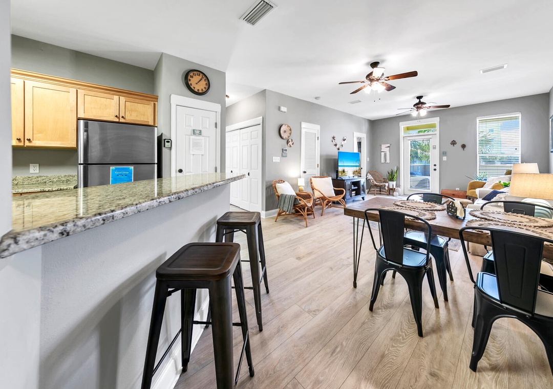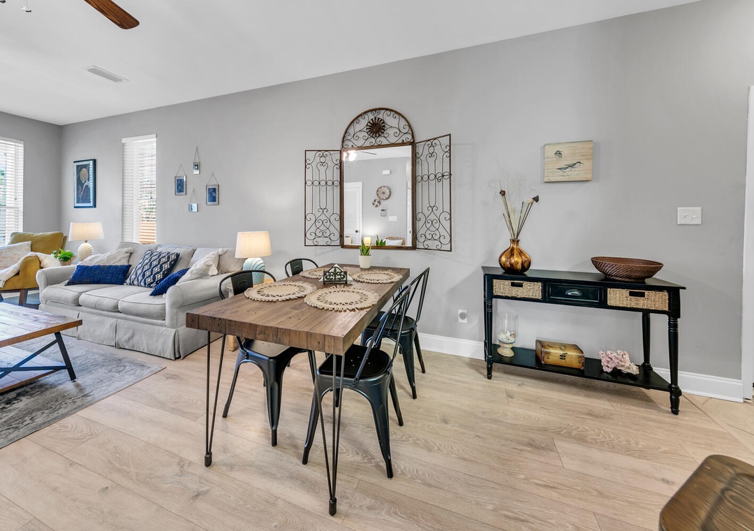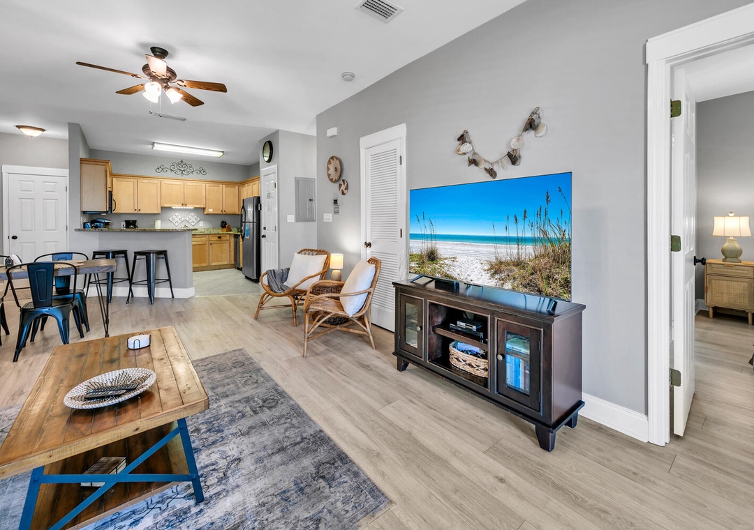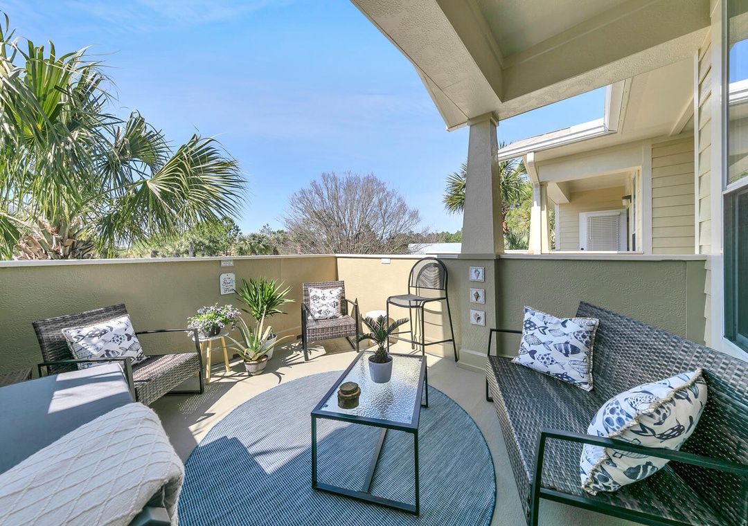 Welcome to Shore Bird Sanctuary, a casual, yet chic 2-bedroom, 2-bathroom condo. This professionally managed Santa Rosa Beach retreat is located in Topsail Village on the west end of 30A. Start your morning by relaxing on the large, private balcony with your favorite cup of coffee as you enjoy the peaceful view of the palm trees overlooking the balcony. This bright and naturally sunlit condo makes a great vacation stay for singles, couples, families, or those looking to celebrate a special occasion. The west end of 30A is distinctly quieter, but it is still incredibly convenient to all the finest area attractions. Shore Bird Sanctuary is equipped with everything you need for your vacation. The open kitchen has all the utensils, plates, and cookware you’ll need to prepare a meal for your family or that romantic dinner. We supply both a Keurig and a drip coffee pot for your convenience.