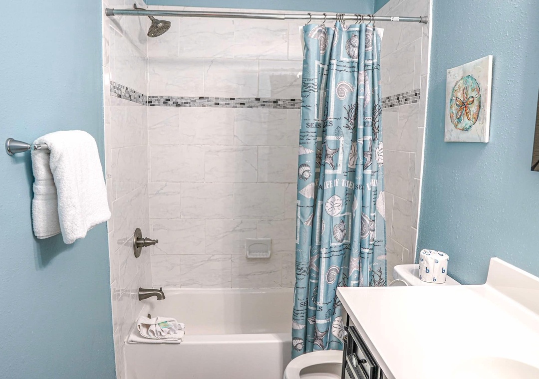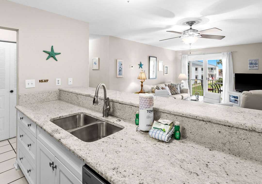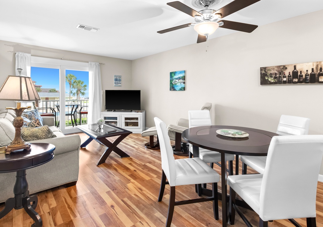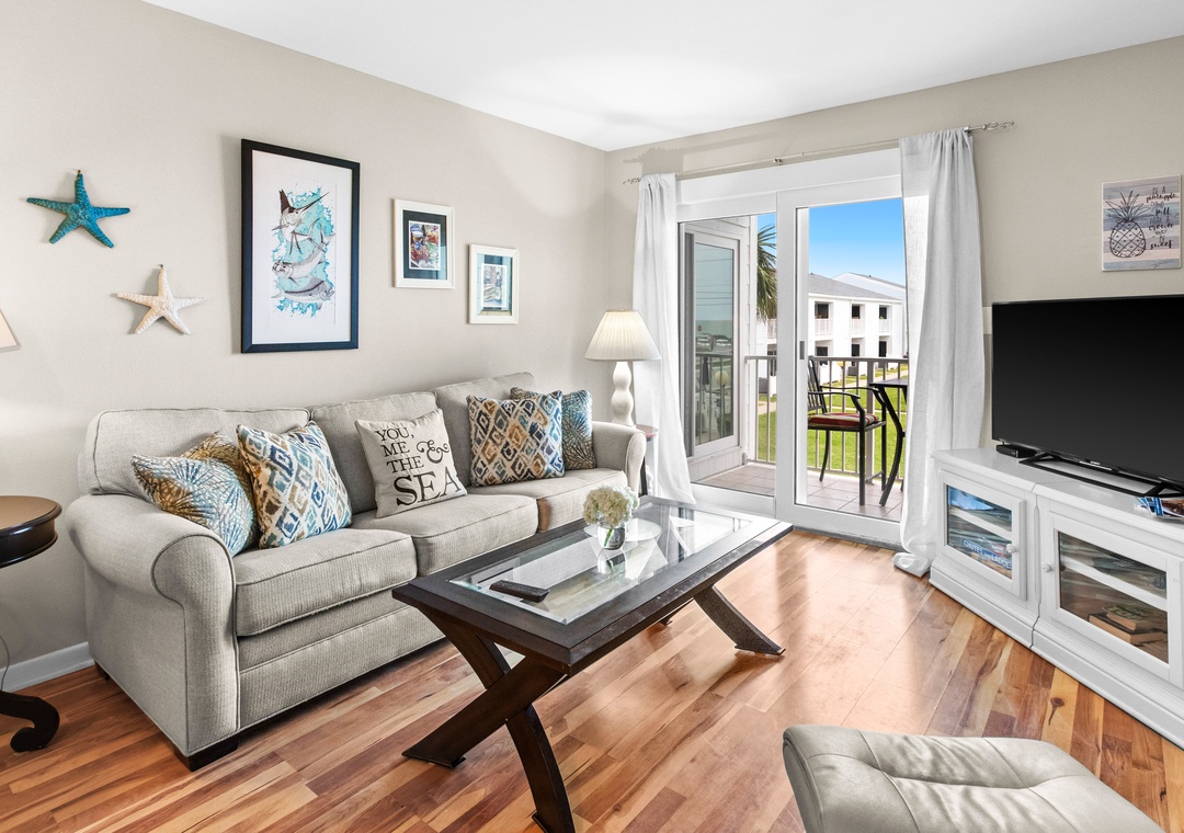 This condo has a large bedroom with a queen bed. The living room and bedroom both offer views of the Gulf. The living room offers a flat screen tv and a queen sleeper sofa. Enjoy a home-cooked meal in your fully stocked kitchen. This unit also offers a washer/dryer.