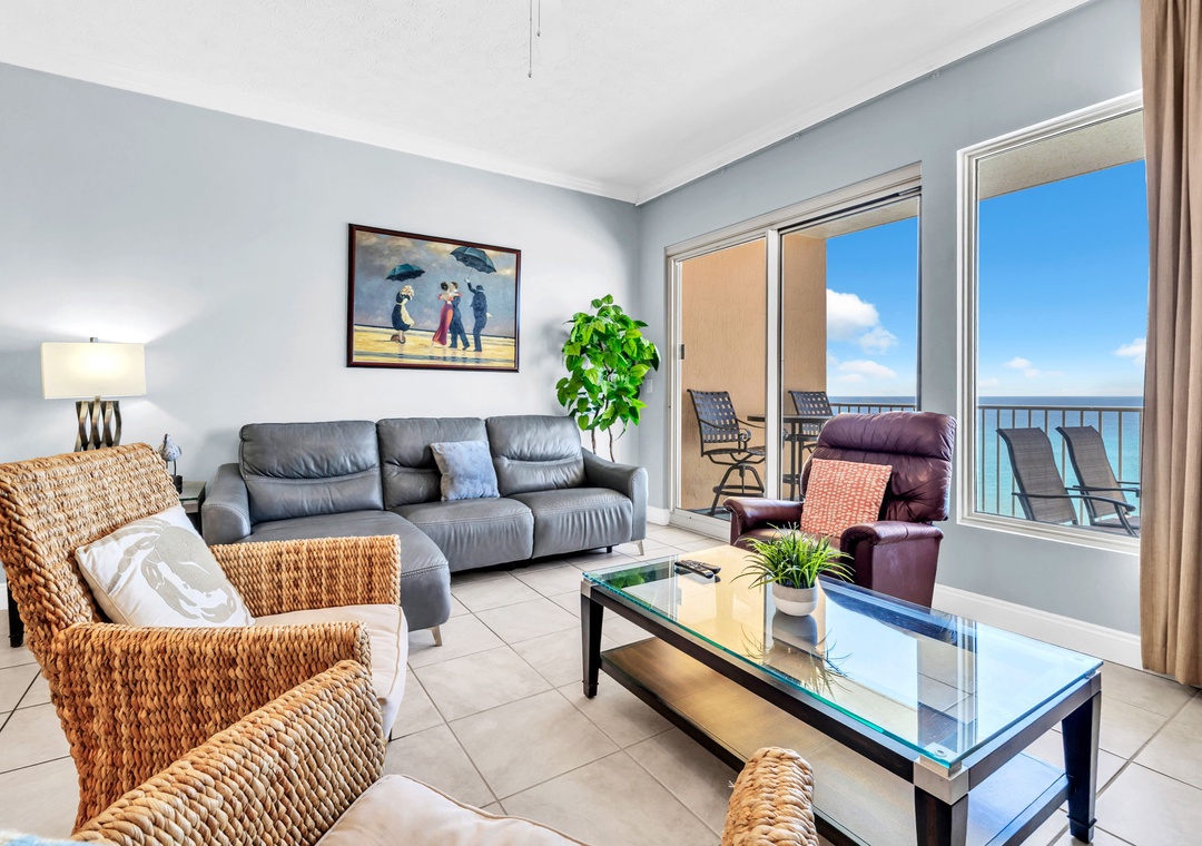 Welcome to Treasure Island 511, your Beachfront Getaway nestled on the quieter end of Panama City Beach. This inviting 2-bedroom, 2-bath condo offers the perfect mix of comfort and coastal charm. Start your mornings with a fresh cup of coffee on your private balcony and end the day watching unforgettable sunsets over the Gulf. Step inside to a bright and spacious living area with large windows in both the living room and master bedroom—each offering direct access to the balcony and stunning ocean views. The serene master suite features a king-size bed and a private bath with a walk-in shower. The guest bedroom includes two twin beds and a twin built-in bunk in the bunk area just off the dining area, providing a fun and cozy space for kids or teens.