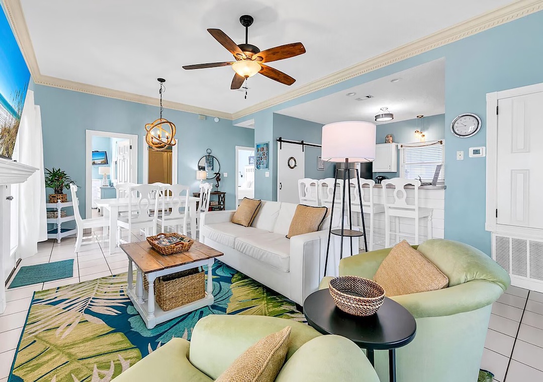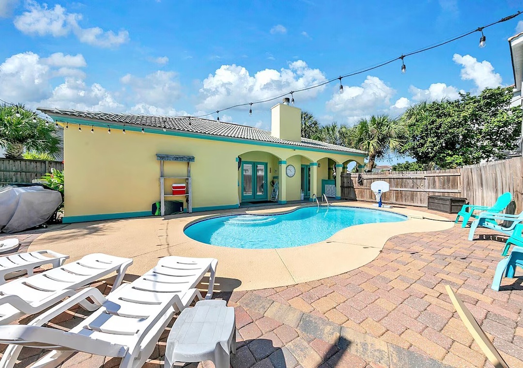 Escape to Tropical Dreams, where paradise awaits just a short walk from the pristine, sugar-white sands of Crystal Beach! This beautiful 3-bedroom, 2-bathroom home offers a spacious open-concept layout, perfect for quality time with loved ones. The fully equipped kitchen is ideal for preparing delicious meals, and the serene back deck and private fenced backyard with a pool and outdoor gas grill provides the perfect place to relax. With plenty of space for quiet retreats, the master bedroom features a king-size bed and an ensuite bathroom, while the two guest rooms include a room with two queen beds and another with a twin-over-full bunk bed plus a twin trundle, comfortably sleeping up to 10 guests. Located within walking distance to gated beach access, plus world-class shopping, dining, and entertainment, this Mediterranean-inspired beach community also offers a community pool, sand volleyball court, and tennis courts. Tropical Dreams has everything you need and more for a perfect getaway!