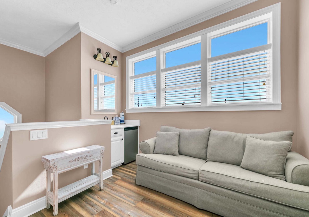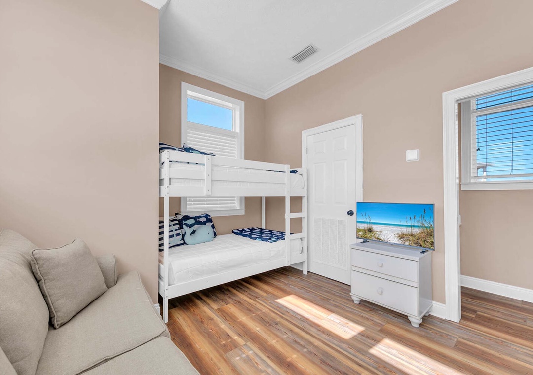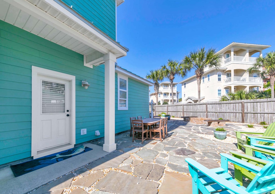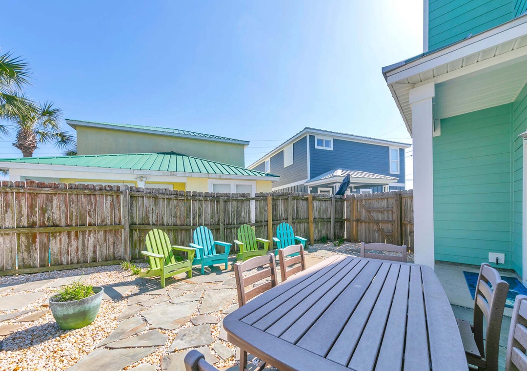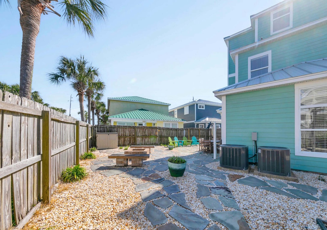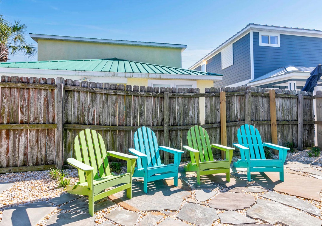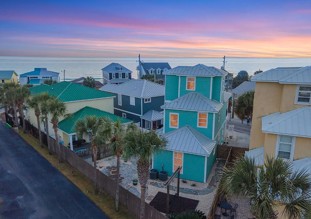 On the first floor, you'll find the first guest bedroom, featuring a king-size bed. The second floor houses the master suite, also with a king-size bed, positioned on the south side of the home. It boasts expansive windows and a private balcony to enjoy the breathtaking Gulf views. The second guest bedroom on this floor features a queen-size bed. The third-floor loft offers a cozy retreat, complete with a sleeper sofa, a wet bar with a sink and beverage cooler, and a private bathroom. Step outside to the backyard oasis, where beautiful flagstone paths are interwoven with white rocks for easy maintenance. This serene space is highlighted by a fire pit, a custom swing set, and an outdoor dining area, making it the perfect spot to relax with family and friends. Come make unforgettable memories at Turquoise Tail — a place where special moments will last a lifetime.