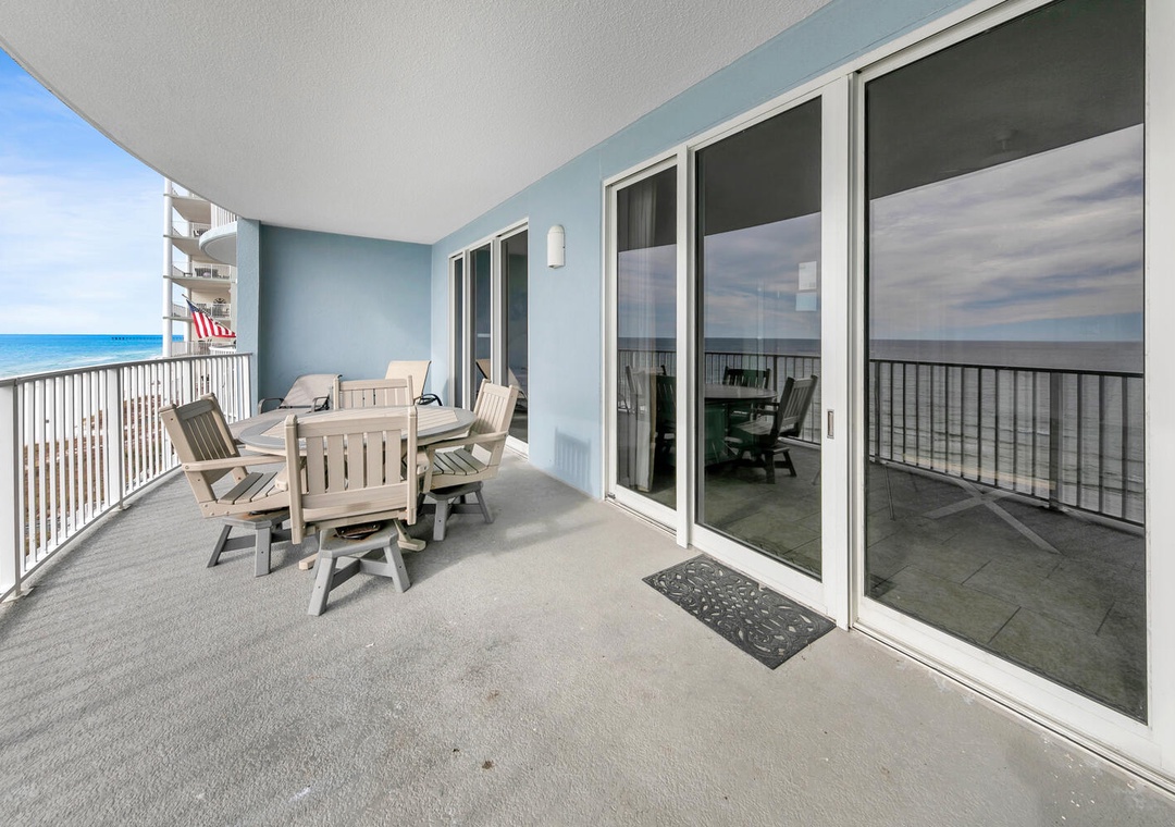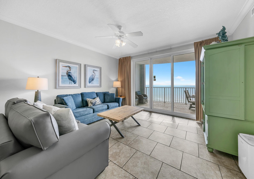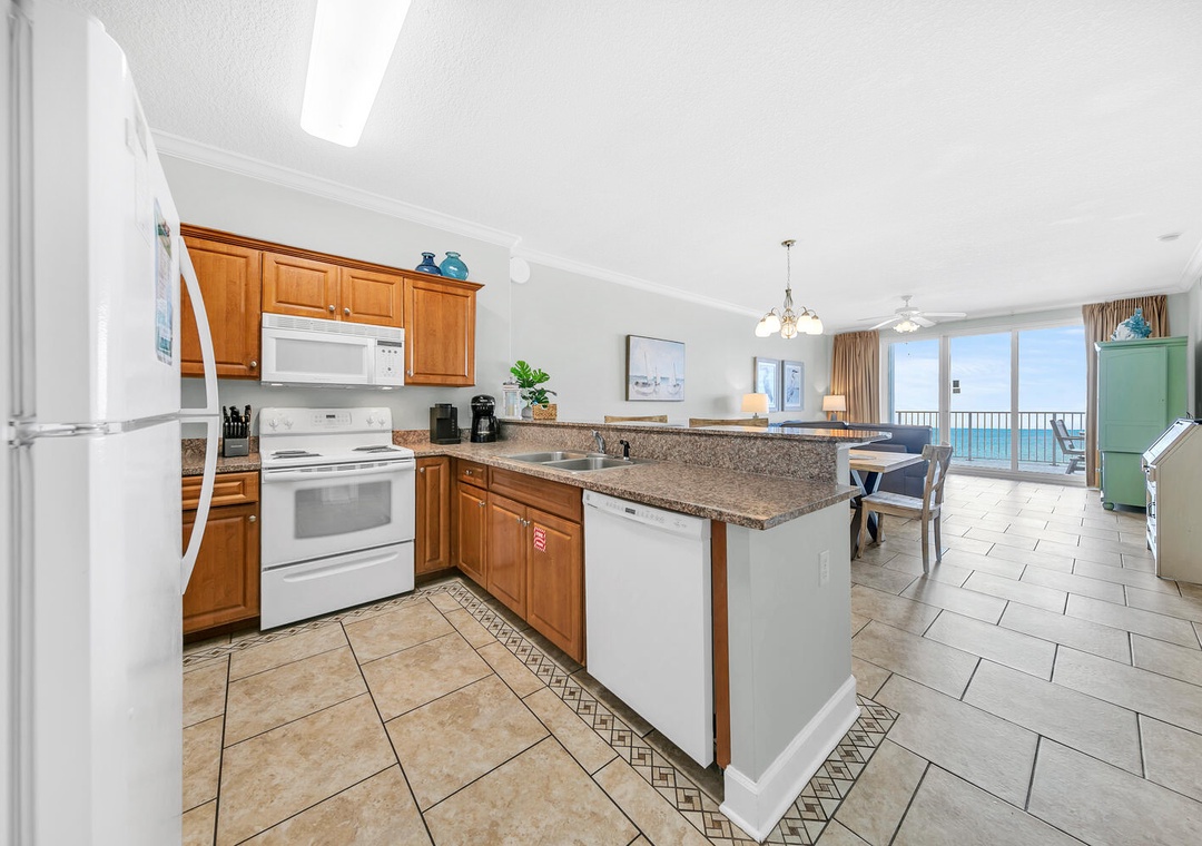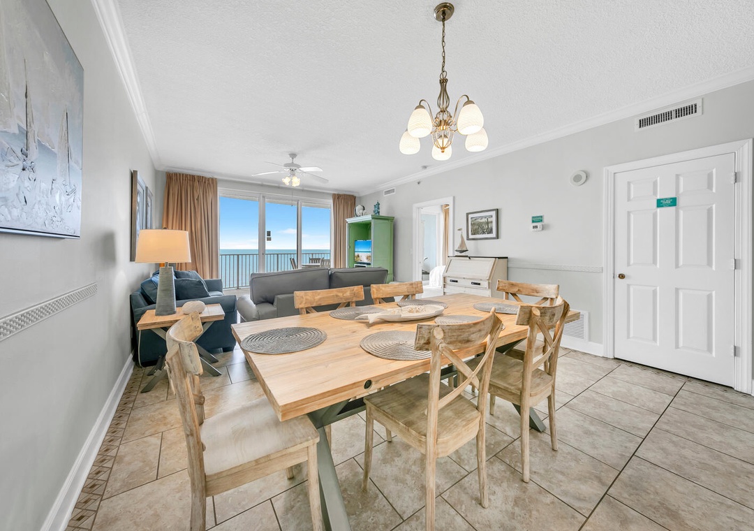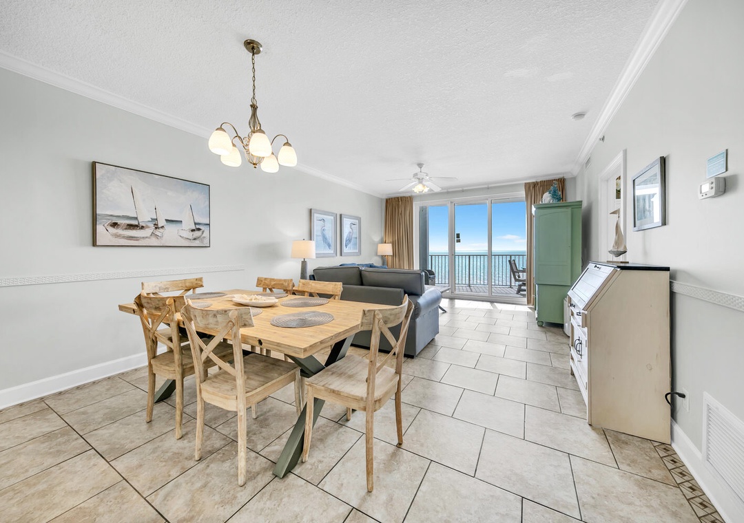 Upon entering this Panama City Beach condo rental, you will be greeted by large, floor to ceiling windows lining the southern wall of the living room serving up mesmerizing views of the dazzling turquoise water. This spacious condo also features a fully stocked kitchen featuring granite countertops and an open dining area.