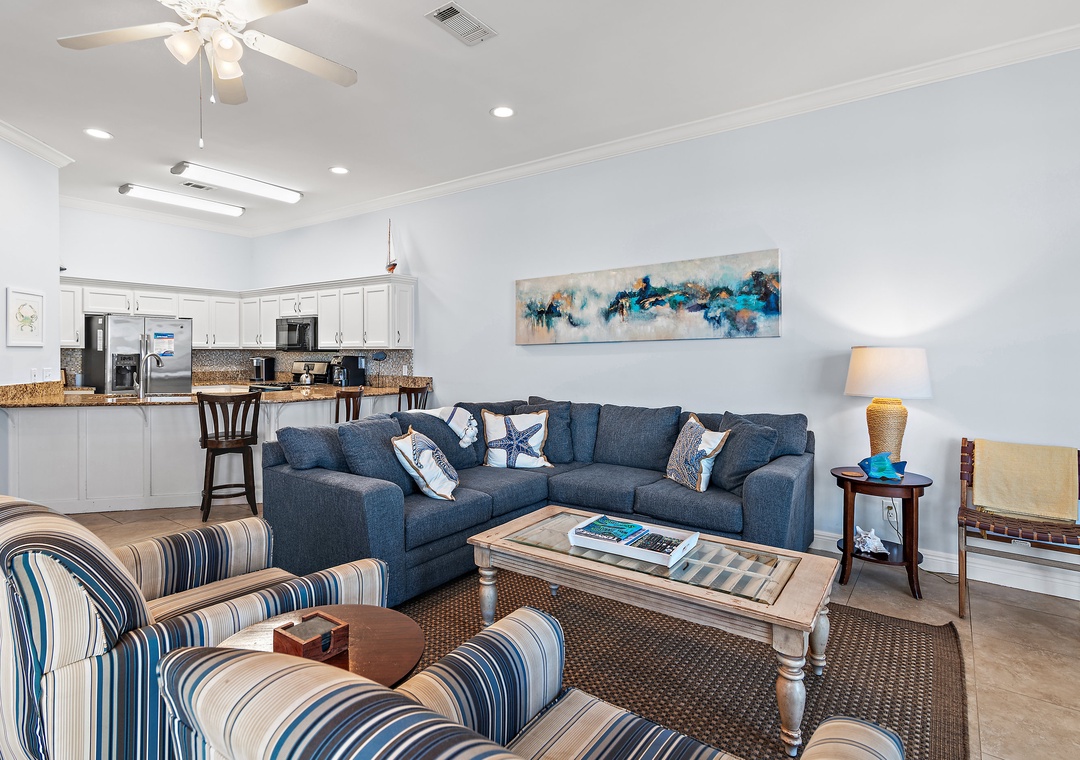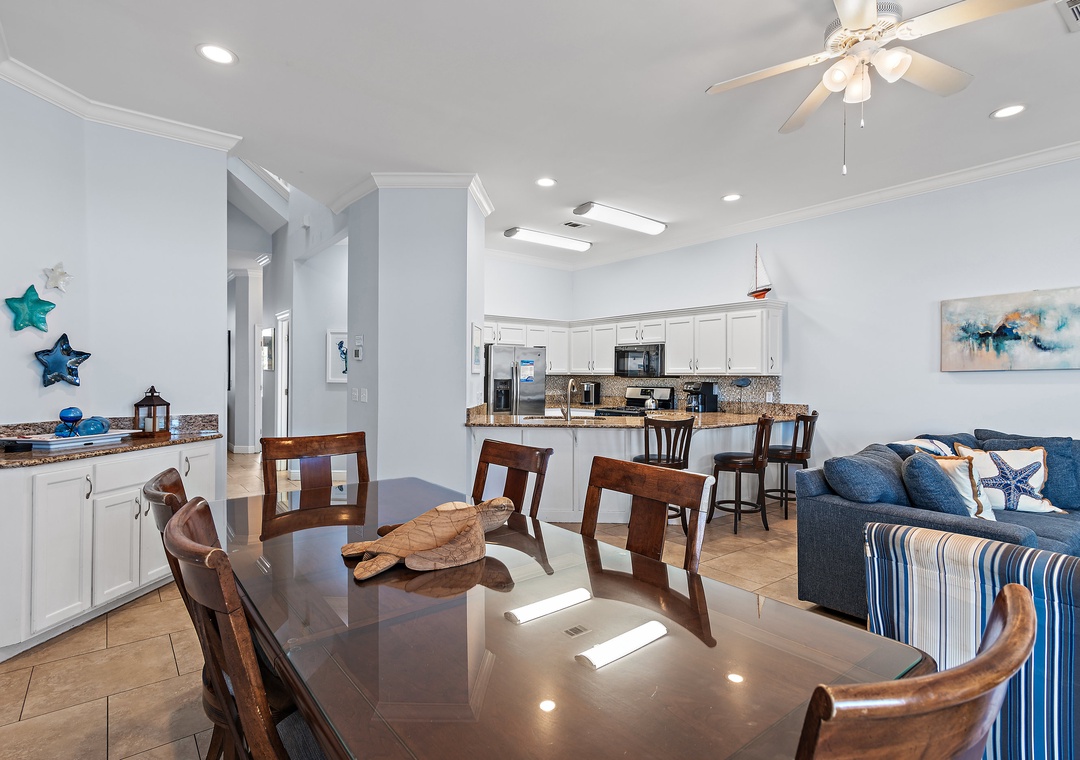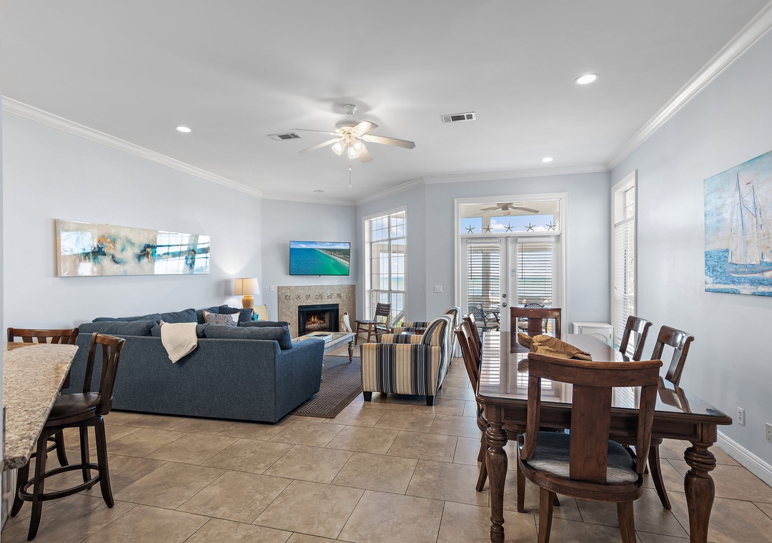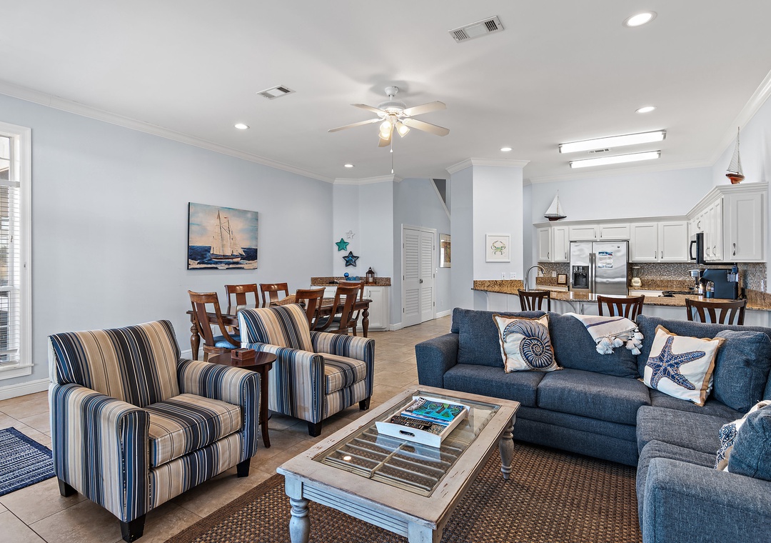 Welcome to Vantage Pointe 43, a stunning bayfront townhome at the Resort, offering one of the most peaceful settings with breathtaking marina views. This beautifully appointed 5-bedroom, 3-bath home comfortably sleeps up to 11 guests, making it ideal for a large family or two smaller families traveling together. Relax and unwind as you take in the sparkling blue waters of the bay just steps from the back door. Inside, the spacious bayfront living room features comfortable seating and a large HDTV—perfect for gathering after a day of fun. The fully stocked kitchen is a dream for any chef, while the dining area includes seating for eight at the table, three at the bar, and an additional outdoor dining table with four chairs on the screened bayfront patio for casual meals with a view.