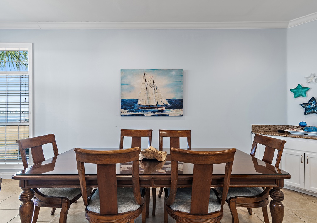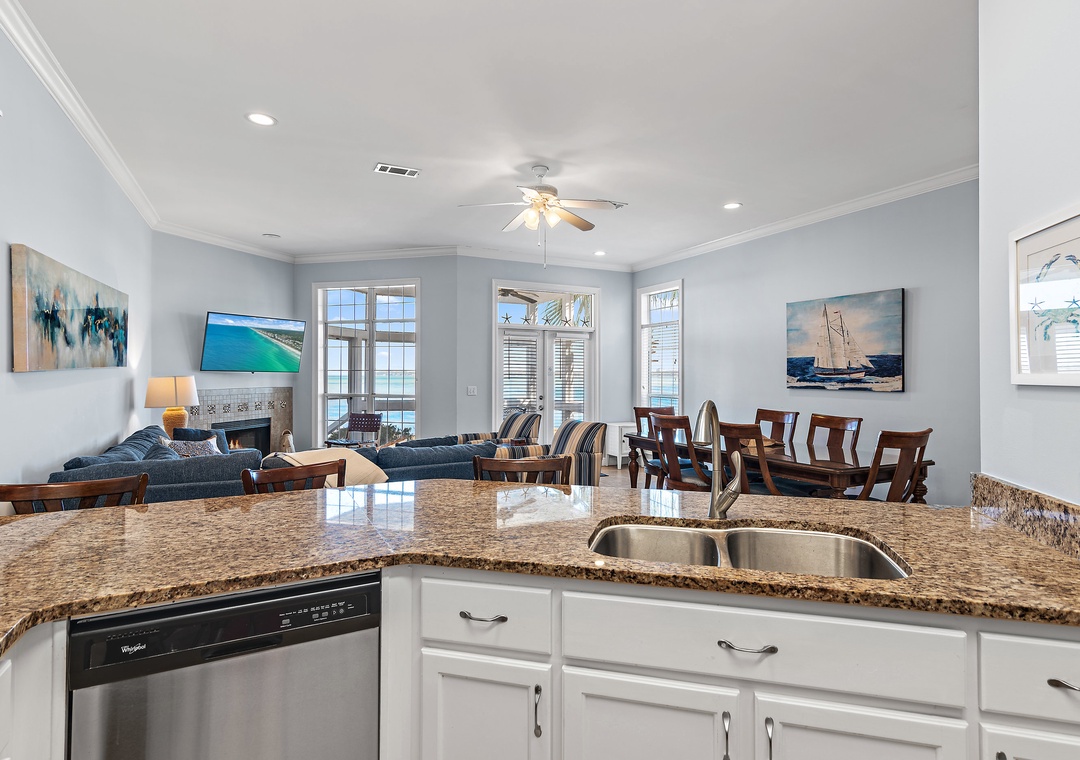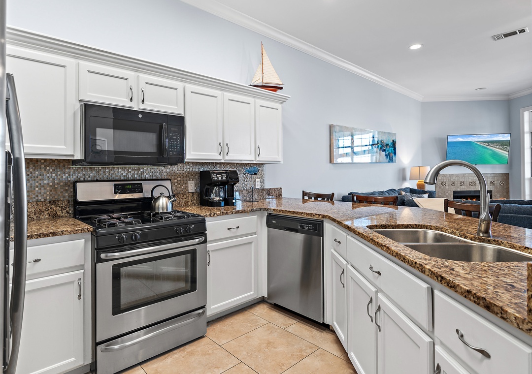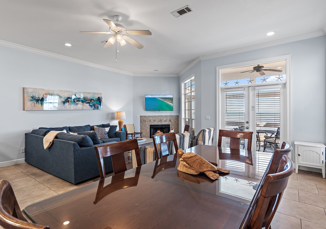 Welcome to Vantage Pointe 43, a stunning bayfront townhome at the Resort, offering one of the most peaceful settings with breathtaking marina views. This beautifully appointed 5-bedroom, 3-bath home comfortably sleeps up to 11 guests, making it ideal for a large family or two smaller families traveling together. Relax and unwind as you take in the sparkling blue waters of the bay just steps from the back door. Inside, the spacious bayfront living room features comfortable seating and a large HDTV—perfect for gathering after a day of fun. The fully stocked kitchen is a dream for any chef, while the dining area includes seating for eight at the table, three at the bar, and an additional outdoor dining table with four chairs on the screened bayfront patio for casual meals with a view.
