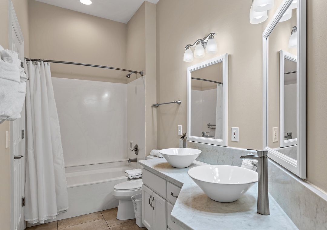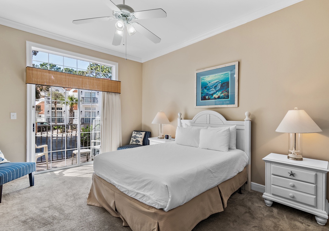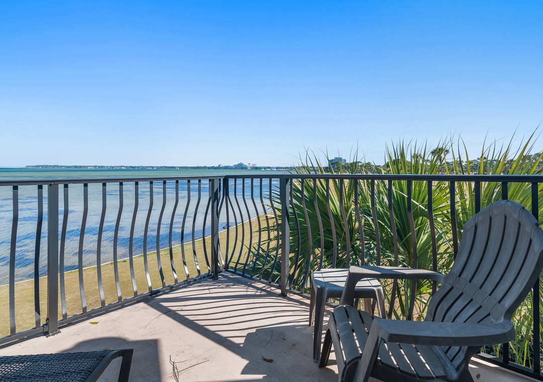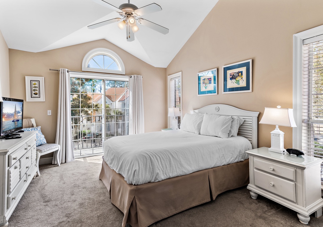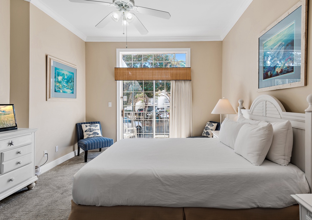 The first level offers a guest bedroom with a queen bed and an adjacent full bathroom with a tub/shower combination. Upstairs, the master suite boasts a king-size bed, a private balcony overlooking the bay, and an en-suite bathroom equipped with a double vanity and a walk-in shower. Also on this level is a queen guest bedroom with its own private balcony and full bathroom. Another guest bedroom includes a twin bed and French door access. The third floor boasts a spacious guest bedroom with two queen beds and a large picture window that fills the room with natural morning light. With two dedicated parking spaces and an unbeatable bayfront location, Vantage Pointe 43 is the perfect place to create unforgettable family memories that will last a lifetime.