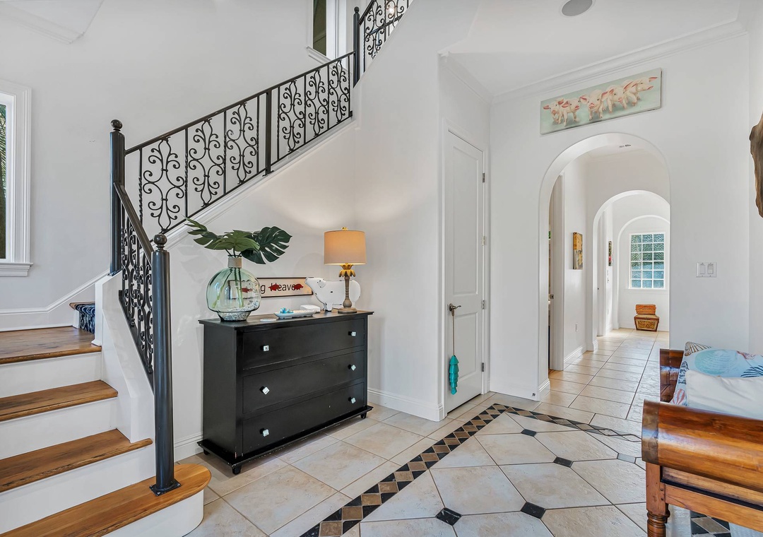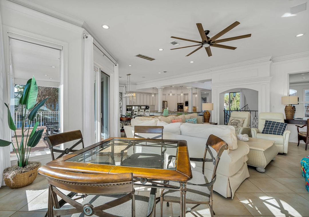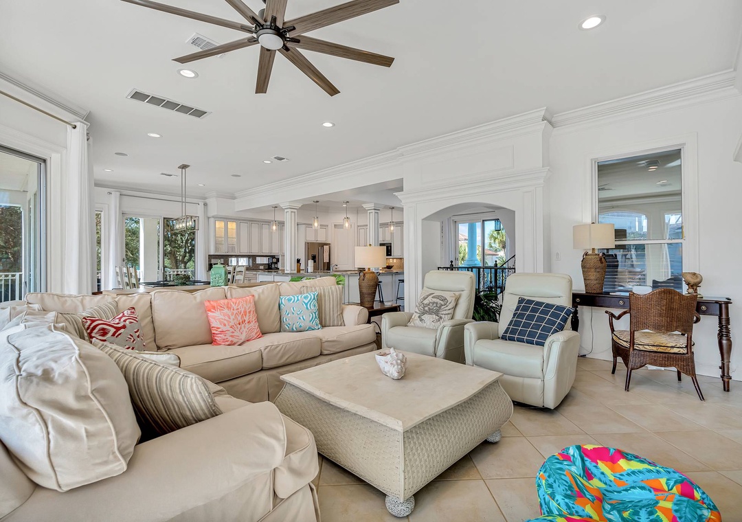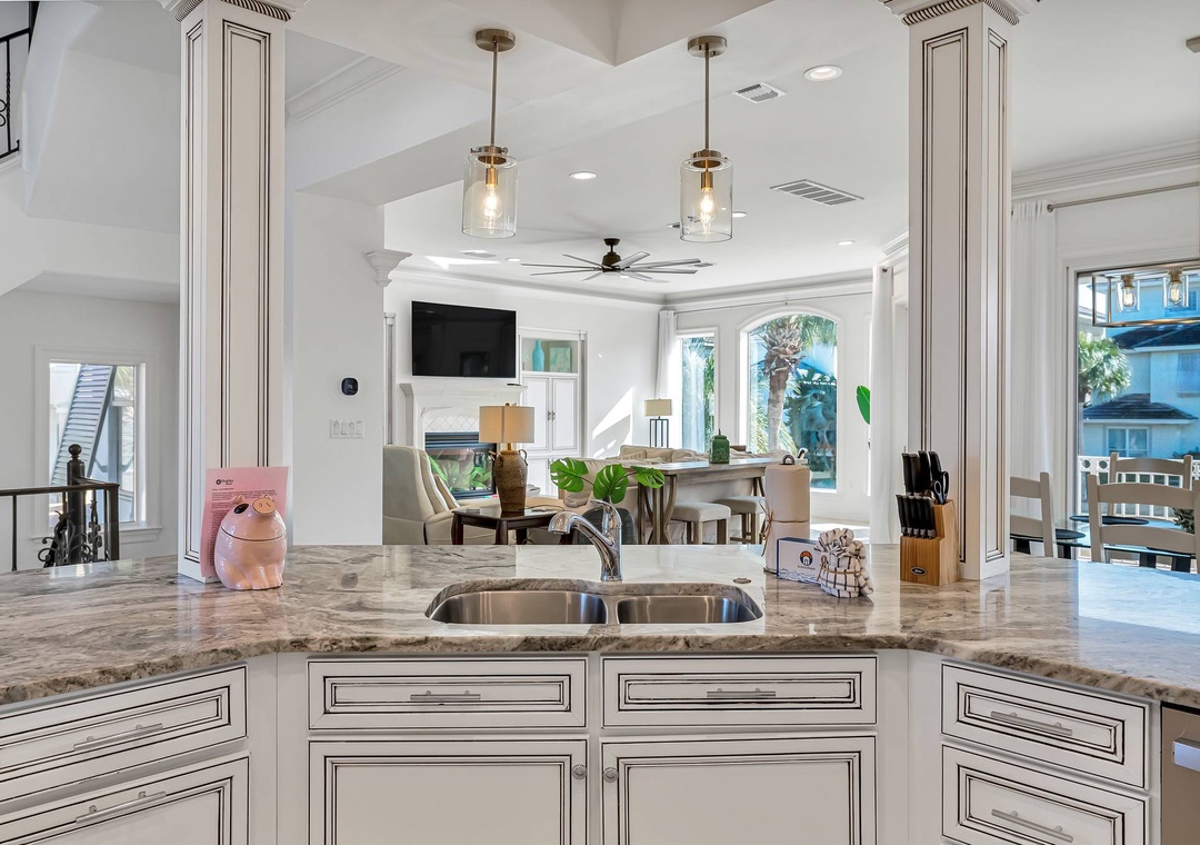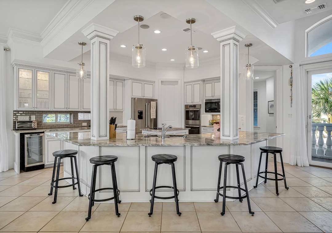 Inside, the open-concept living and dining areas create a bright and inviting space for gathering, whether you're sharing stories from the beach or enjoying a family meal. The gourmet kitchen is fully equipped with high-end appliances and ample counter space, making it easy to prepare everything from quick breakfasts to fresh seafood dinners. From poolside relaxation to memorable evenings with loved ones, Villa Serendipity is your perfect home base for effortless coastal living.