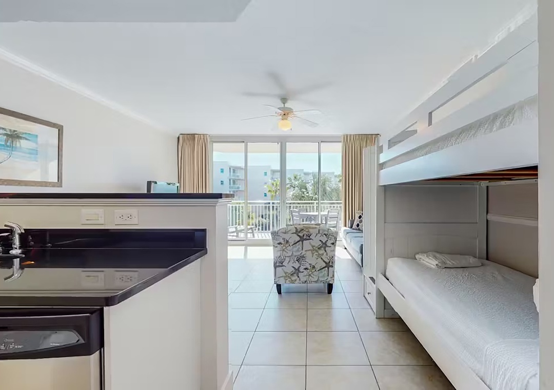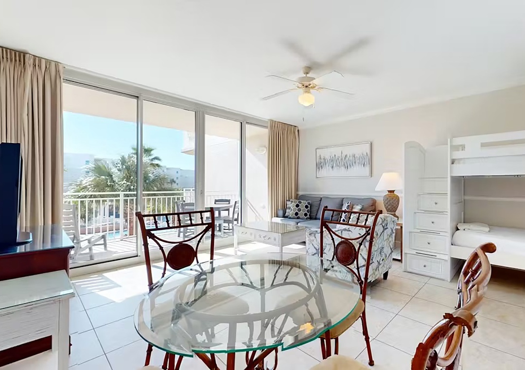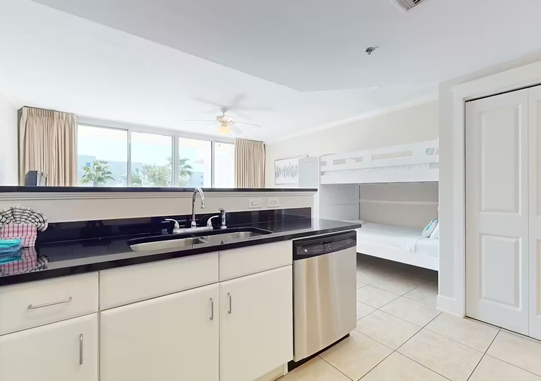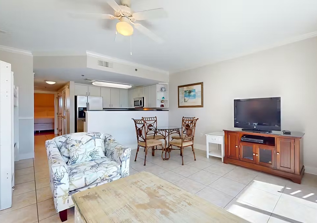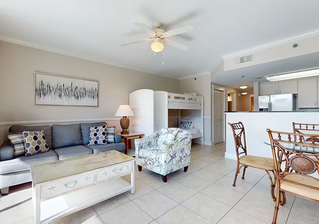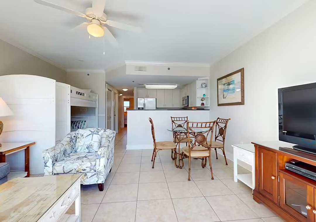 Unwind in the king suite, featuring a private ensuite bathroom and a flat-screen TV. The unit also includes a twin-over-twin bunk bed and a queen sleeper sofa in the living room, offering flexible sleeping arrangements for everyone. Prepare delicious meals in the fully equipped kitchen, then gather around the dining table to plan your daily adventures. After a fun day in the sun, relax in the cozy living room or step out onto the balcony to enjoy a beverage with a pool view. For added convenience, the condo includes an in-unit washer and dryer. With comfort, convenience, and resort-style amenities, Waterscape 424B is sure to become a family favorite youâll want to return to year after year.