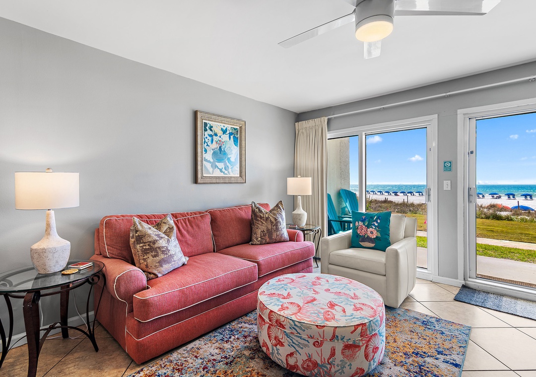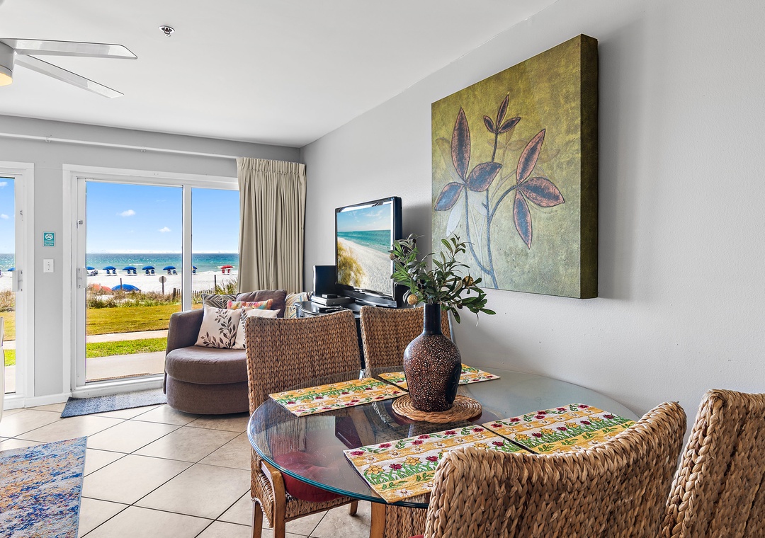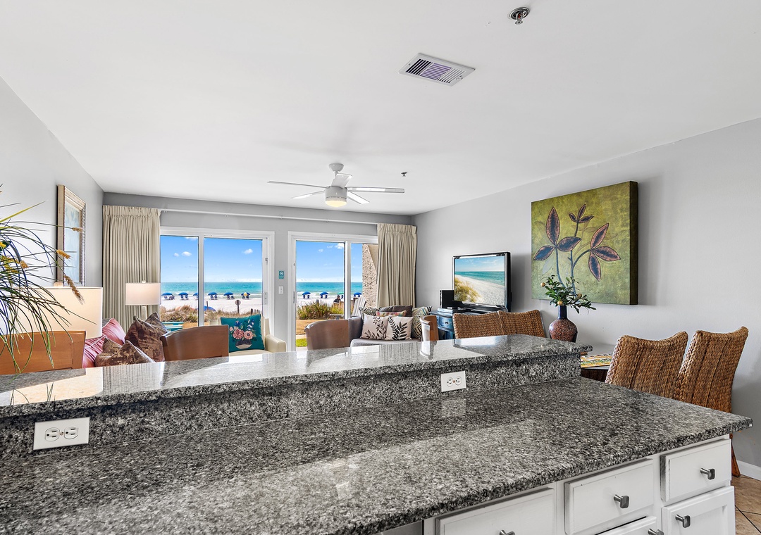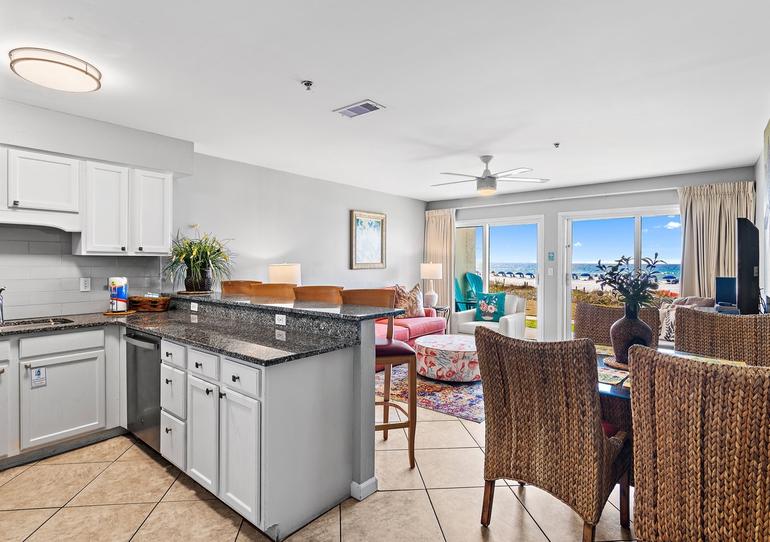 Look no further than Windancer 111! This Beach FRONT 1BR+bunks/1.5BA condo has unbeatable Gulf Views right out your back door! The kitchen is fully equipped with granite counters and stainless-steel appliances. With a king bed in the bedroom, twin bunks in the hallway, and a sleeper sofa in the living area, this condo sleeps 6 guests comfortably! Also, enjoy the convenience of the in-unit washer and dryer. Enjoy the stunning Beach Views or make a splash in the Gulf Front pool. Have a true beach vacation at Windancer 111!
