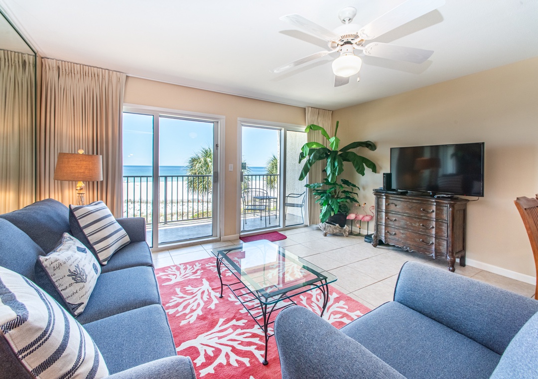 Look no further than Windancer 207! This Beach FRONT 1BR+bunks/1.5BA condo has unbeatable Gulf Views from the living room, kitchen and balcony! The kitchen is fully equipped and there’s a washer/dryer for your convenience. With a king bed in the bedroom, twin bunks in the hallway, and a sleeper sofa in the living area, this condo sleeps 6 guests comfortably! The spacious bathroom even has a jetted tub. Enjoy the stunning Beach Views or make a splash in the Gulf Front pool. Have a true beach vacation at Windancer 207!