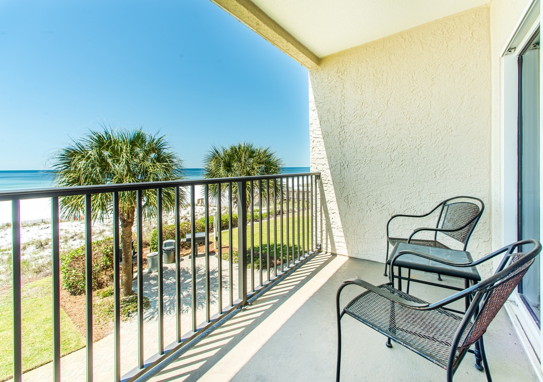 Katie, we appreciate you taking the time to provide us with some feedback regarding your great vacation rental experience while staying in Windancer 207. We are happy to know that this property met your expectations, you thought the view, balcony, easy private beach access and beach chairs were perfect, and you would recommend staying here to others. We apologize for any inconvenience caused by such products as coffee not being provided. For food safety reasons, spices, condiments, etc. are not left for guests to use. We will forward your message to property managers so that they may review and assess the need for updated outdoor furniture. Thank you for choosing Real Joy.Real Joy staff