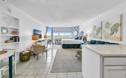 The Top of the Gulf complex’s game room boasts a pool table and a foosball table. The pool area features a shuffleboard court that also offers cornhole boards. A large swing and an oversized Adirondack chair add to the beachy atmosphere, and the internet cafe is poolside with dedicated wifi internet in a shaded space. Top of the Gulf features immaculate landscaping, pristine beachside amenities and a gorgeous pool, (with kiddie pool) where personal chairs and coolers are welcome. Grills are also provided for personal use. The onsite Surf Snack Shack offers grill items, drinks, smoothies and other goodies.